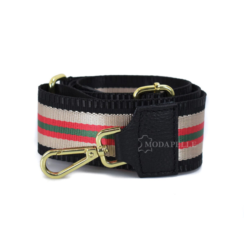 Verstellbarer Taschengurt in grün-rot Farben. Mit goldenen Metallteilen und Lederdetails in schwarzer Farbe.