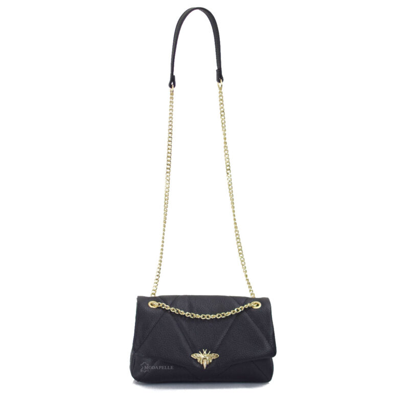 Shoulder bag by Modapelle in black color. It has two compartments separated by a third one that closes with a zipper. On the sides, it has an additional pocket that also closes with a zipper.